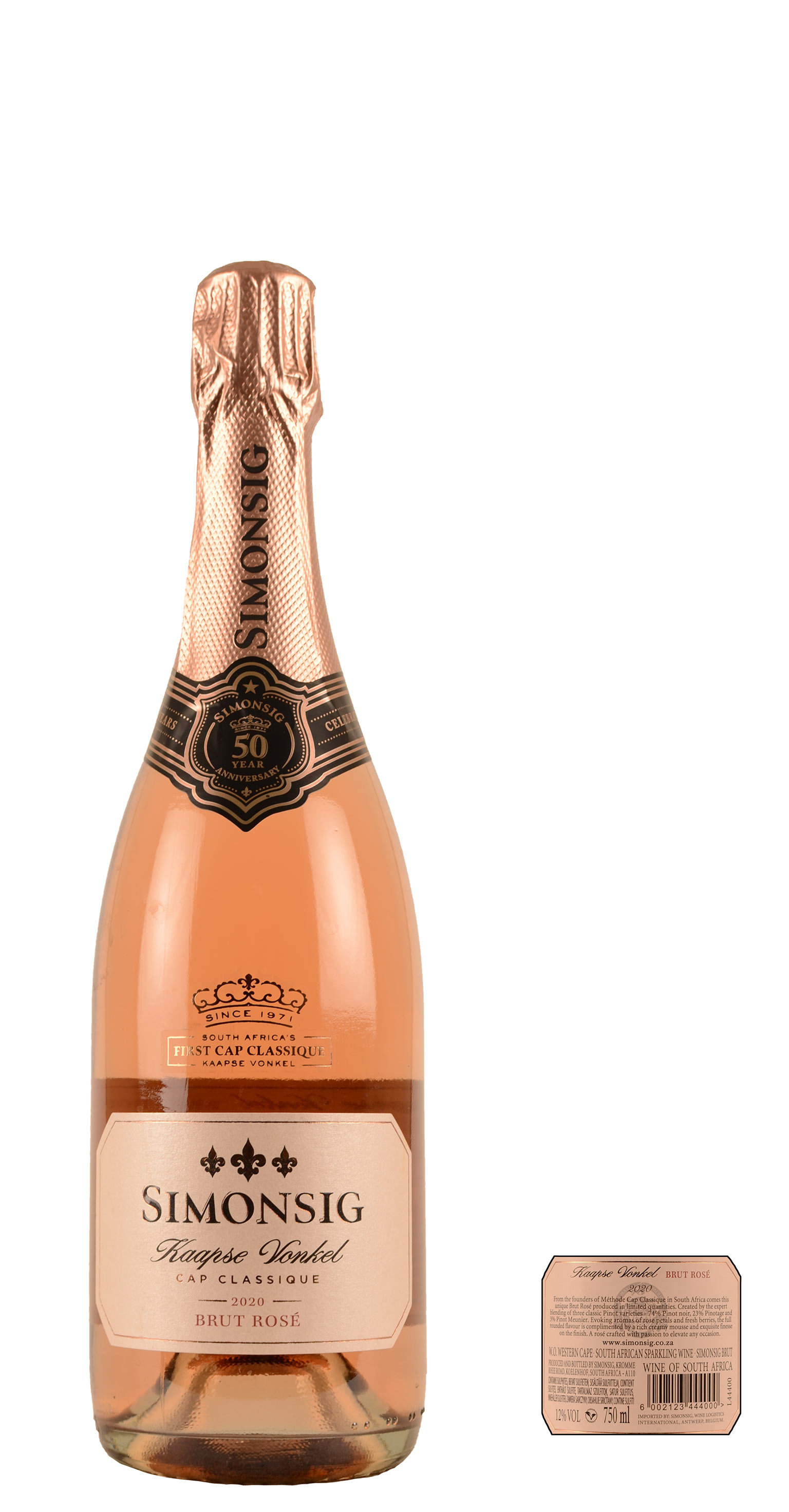 24% Pinotage en 76% Pinot Noir. Naast de witte Brut lanceerde Simonsig in 2005 ook een rosévariant van hun Kaapse champagne. Keldermeester Johan Malan laat de schilletjes heel even hun pigment afgeven aan het druivensap zodat een elegante zalmrose kleur ontstaat.